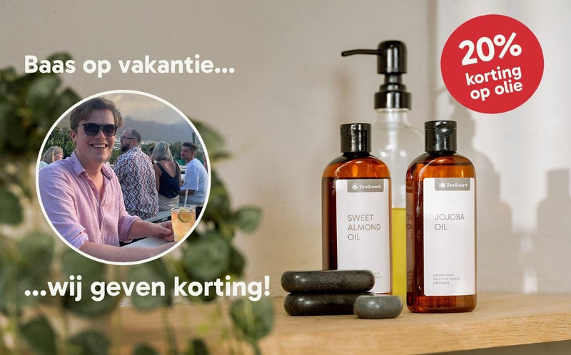 De baas is op vakantie, dus wij geven korting! Geldig op alle massageolie en etherische olie. De actie loopt tot 16 t/m 22 maart, korting is al verrekend op de website.